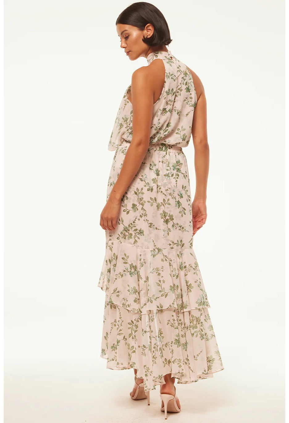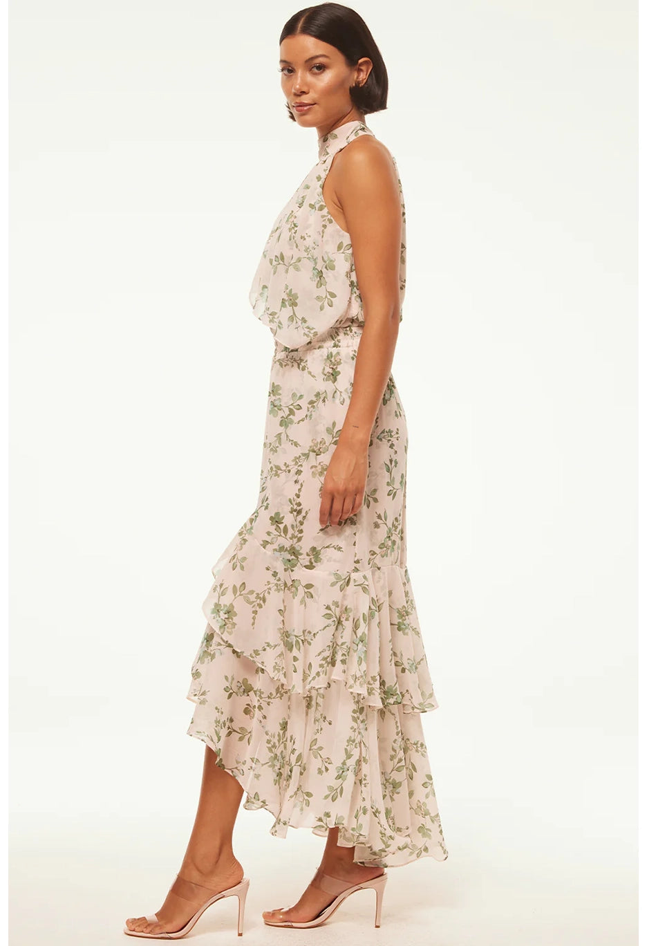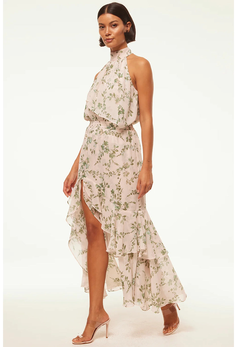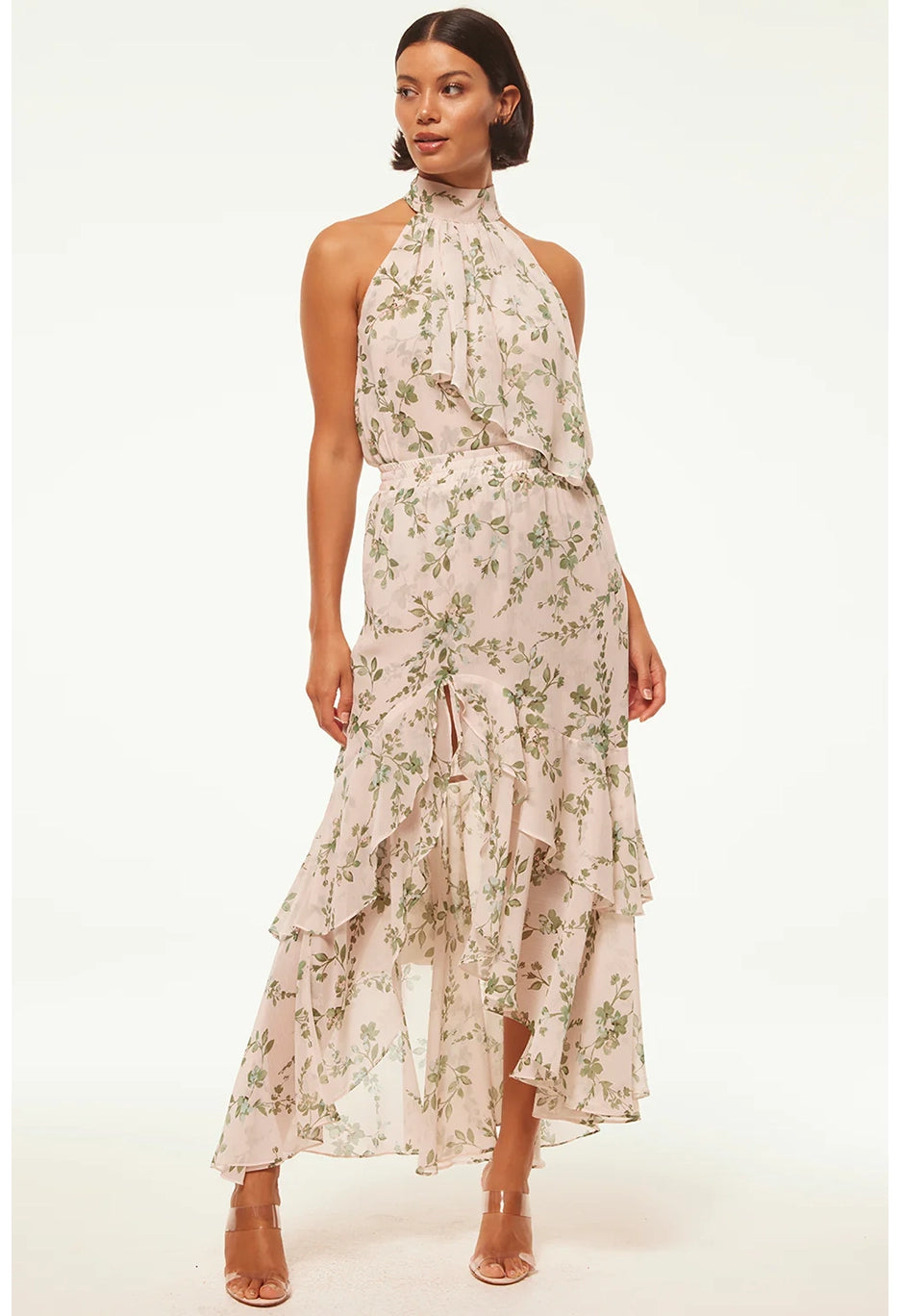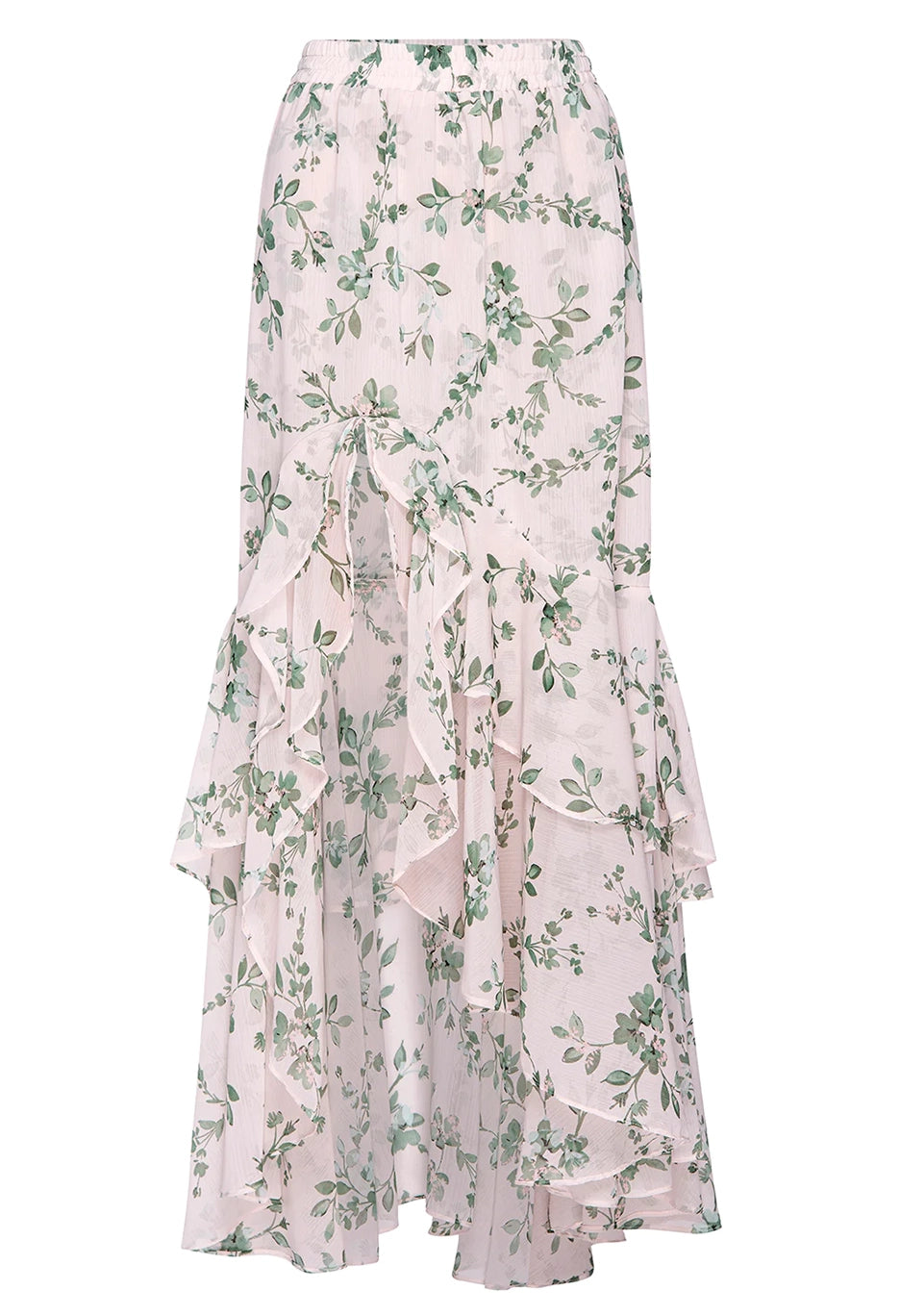 Make a statement in the Seva skirt, a stunning sage botanical print on warm ivory chiffon ground. The perfect event ready piece that also transitions effortlessly from day to dinner. The asymmetrical skirt features gorgeous ruffles, a playful slit front opening and elastic waist.