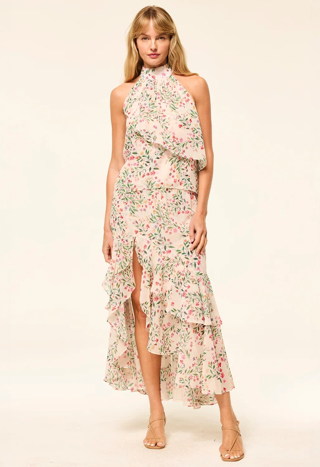 For a stylish transition from day to dinner, try the classic Seva skirt. Made from a timeless Spring Ditsy printed chiffon, this asymmetrical skirt features gorgeous ruffles, a playful slit front opening, and an elastic waist. Complete the look with the coordinating Anka top.