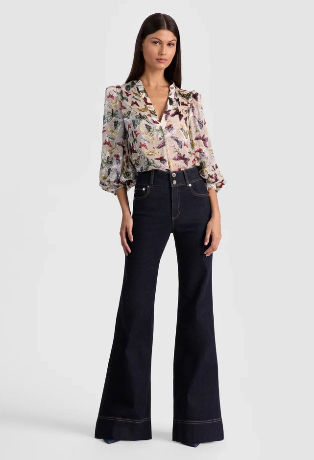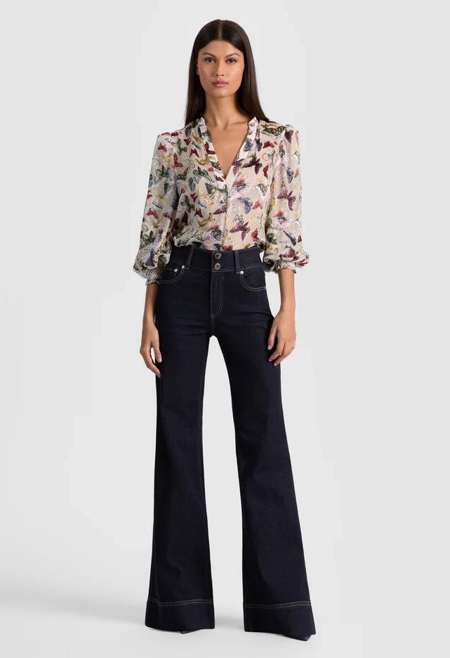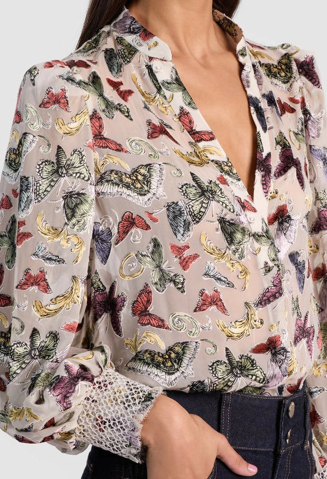 Sheila is a delicate silk-blend blouse featuring a relaxed henley style with a soft V neckline and smocked cuffs for a subtle romantic detail. Its burnout satin floral pattern lends an artistic, elegant vibe, while the comfortable silhouette ensures versatile wear. Ideal for both work and social occasions, this blouse effortlessly elevates your look with minimal effort.