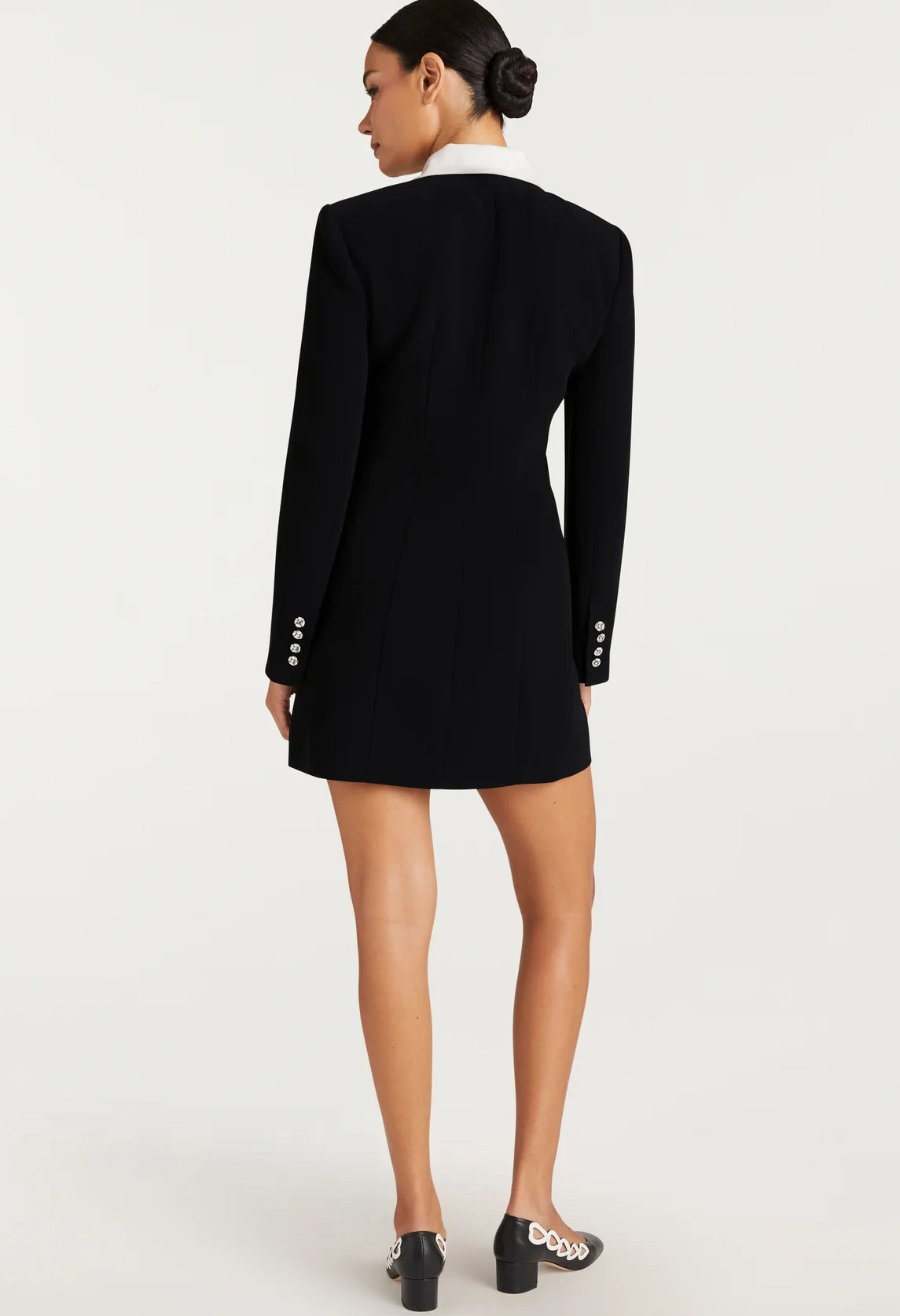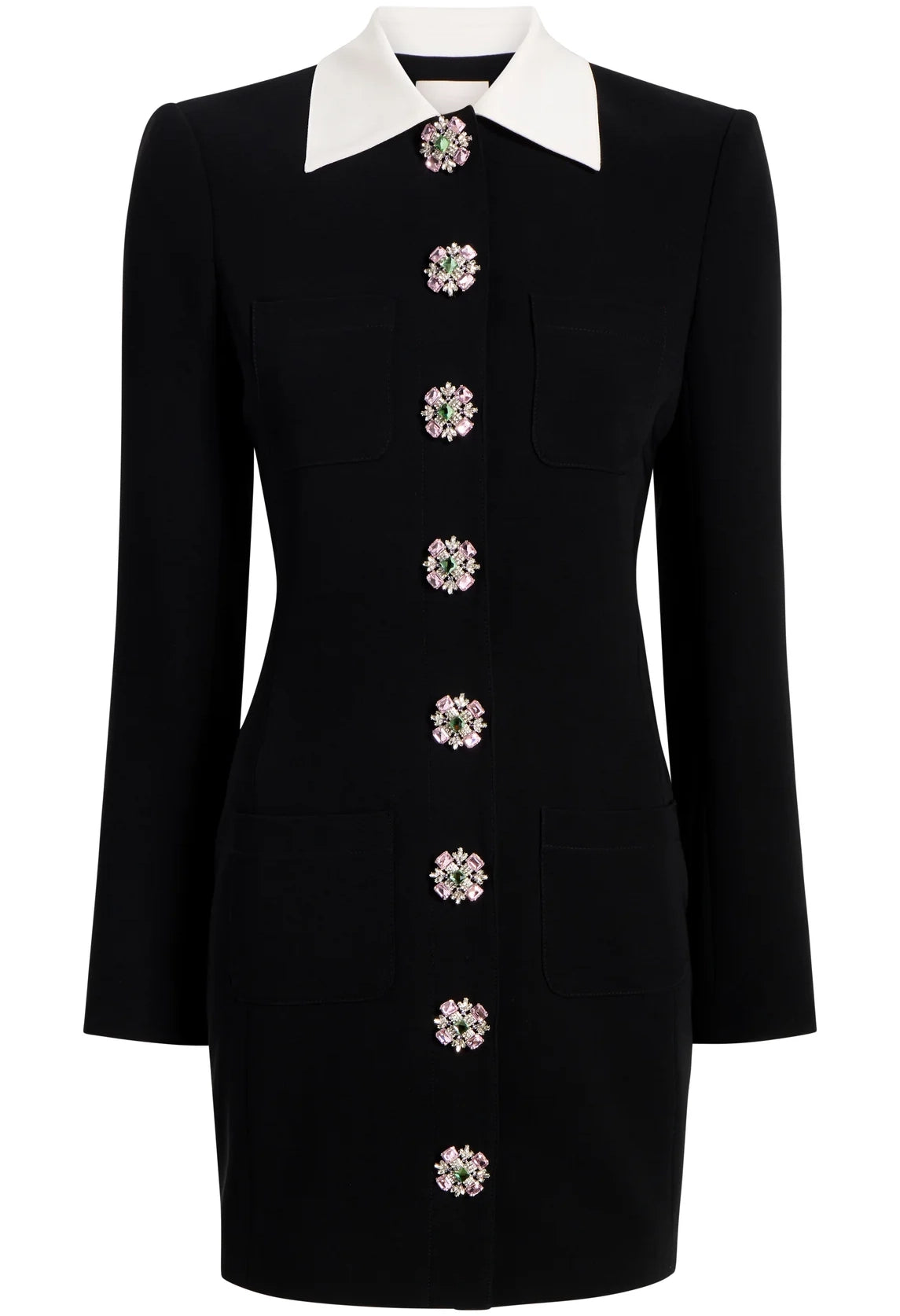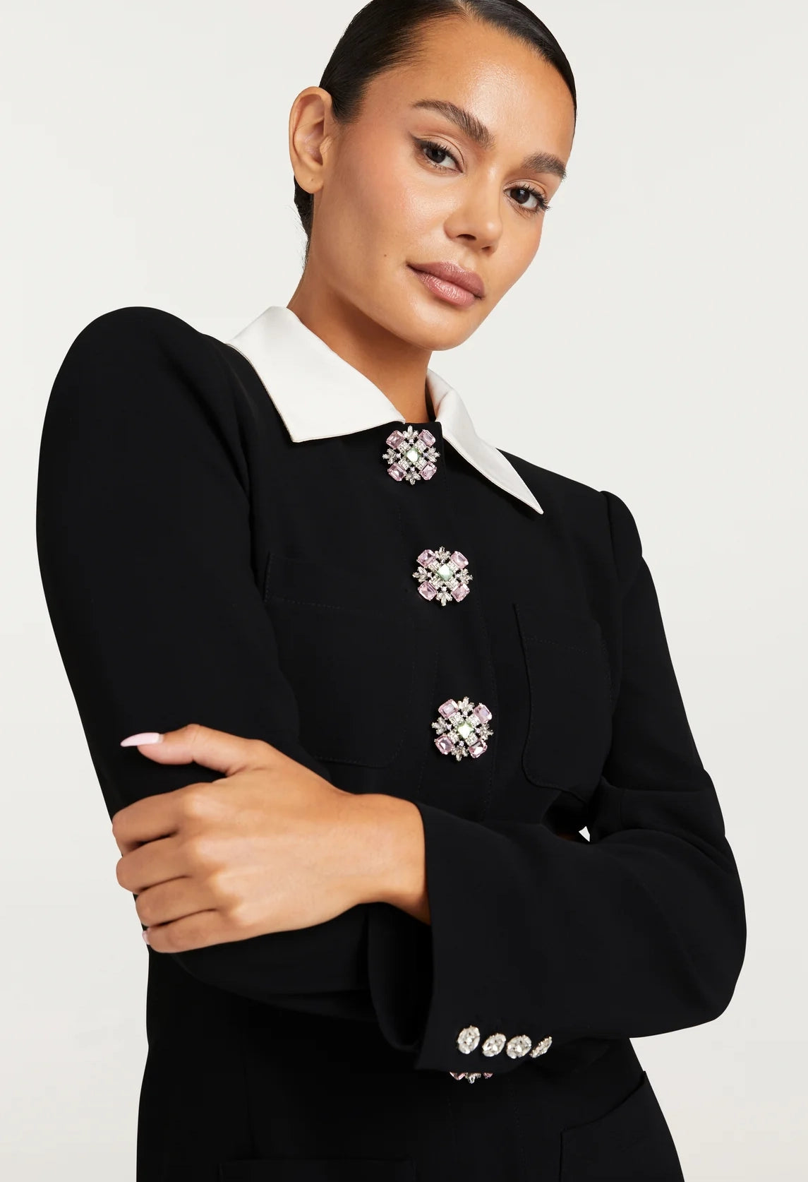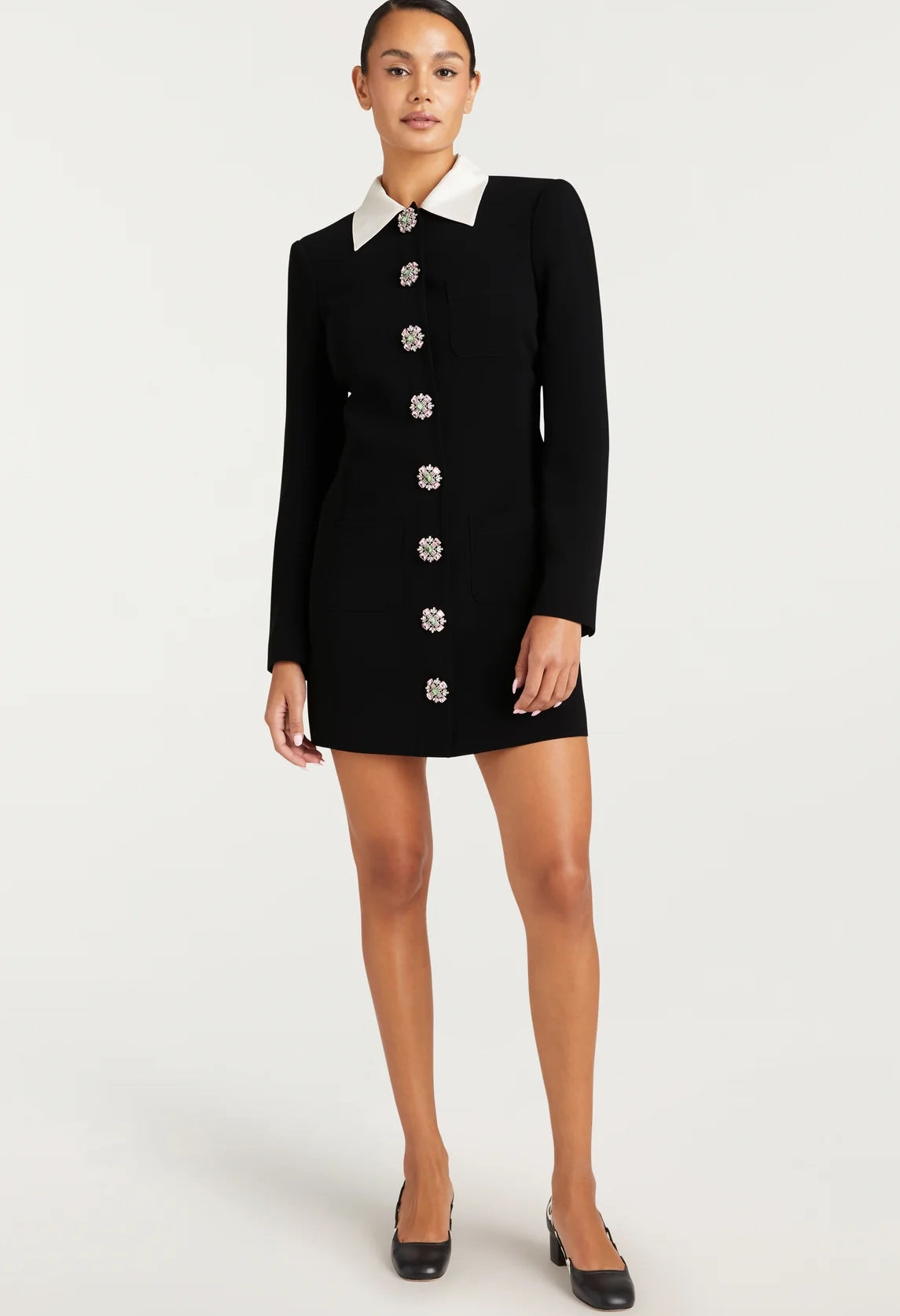 Upgrade your wardrobe with the flattering Sheryl Dress. Made with Drapey Crepe fabric, this mini dress features a collared neckline and long sleeves for a stylish look. The embellished button adds the perfect touch of elegance. Get ready to turn heads in this must-have dress.