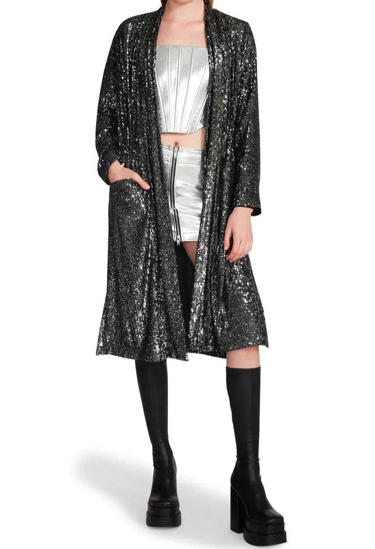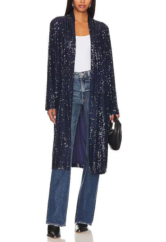 All over sequins add plenty of dazzle to this sweeping open-front duster that's ready for your next night out.