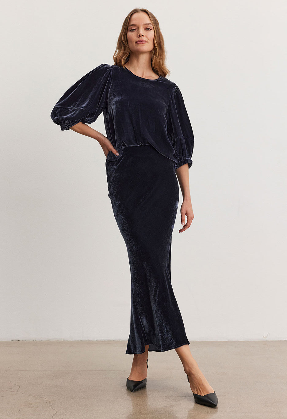 This elegant maxi skirt is expertly crafted from luxurious silk velvet. It features an elastic waist for added comfort and a sleek fit through the hips that subtly flares at the hem. Its refined texture and graceful drape make it the perfect choice for any occasion.