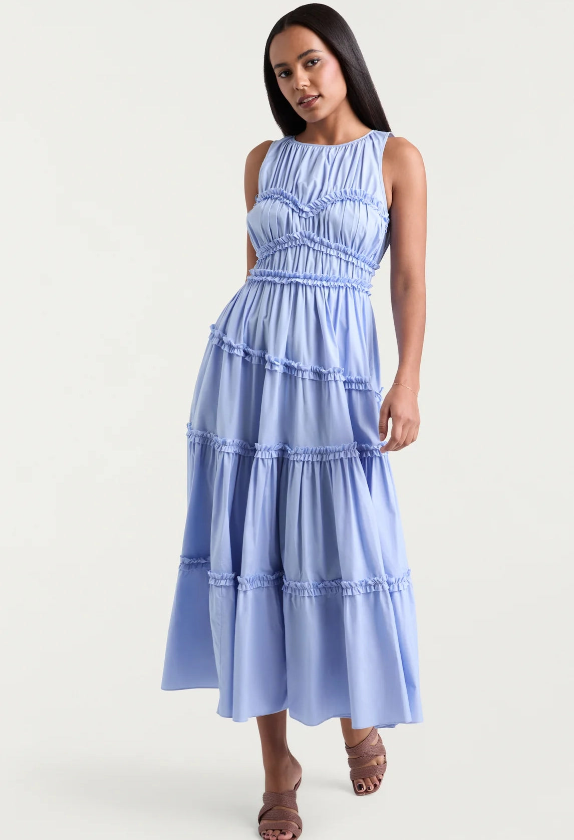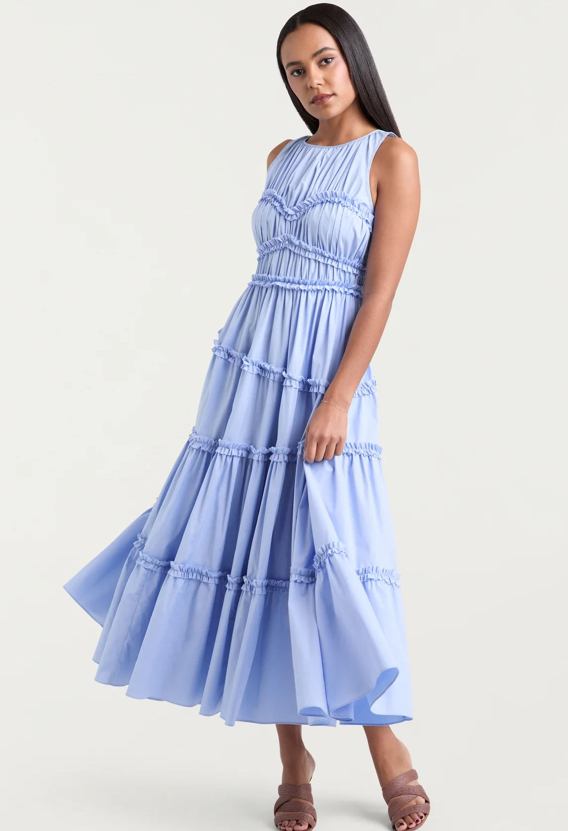 The Sirrina Dress features sky blue color, midi-length, and a soft cotton blend for a refined look. With a high neck and sleeveless design, this dress boasts a sleek and elegant silhouette, offering both style and comfort. A must-have for any occasion, this dress is a staple in any wardrobe.