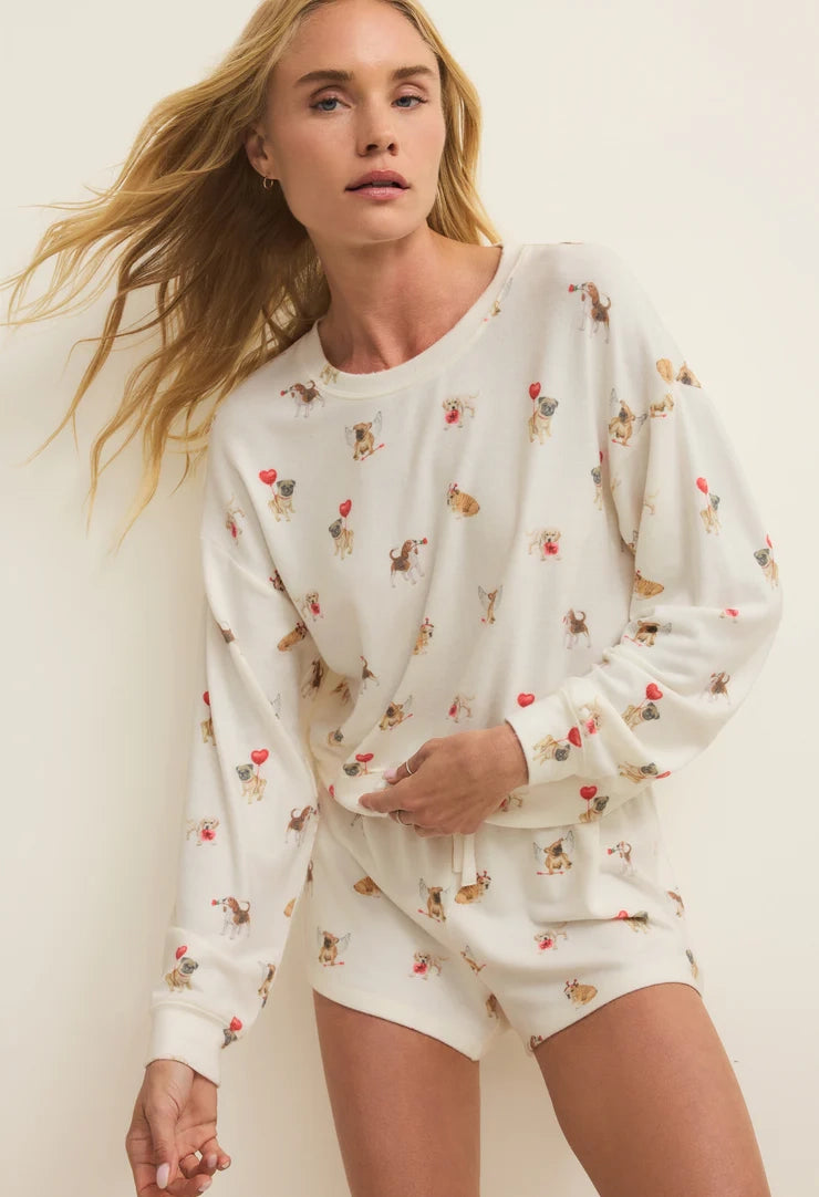 Crafted from a brushed sweater knit fabric, this drawstring short set delivers comfort with its soft, lightweight construction and relaxed fit. The playful canine-themed print celebrates your passion for dogs while maintaining an effortless, casual style.