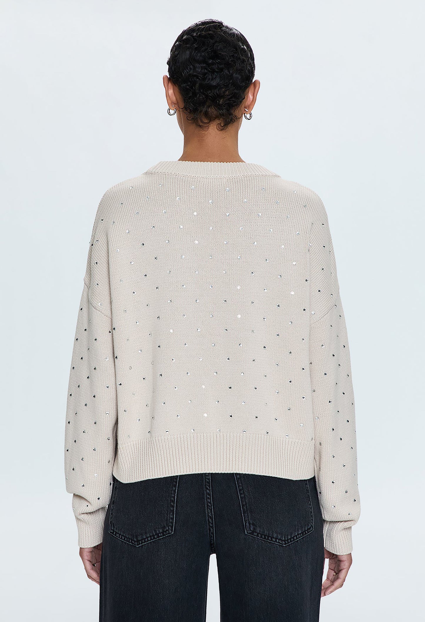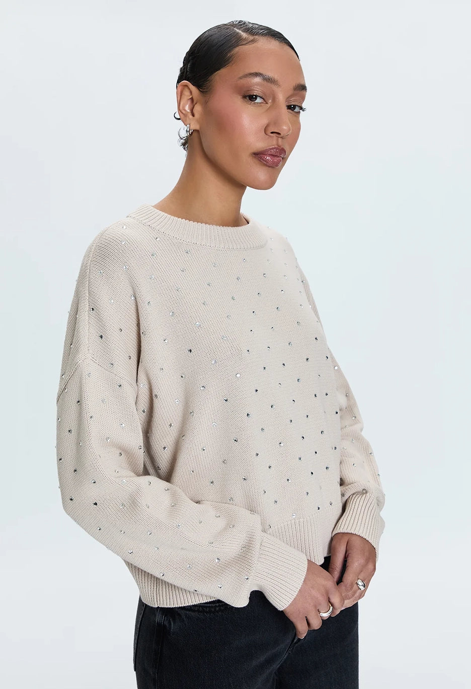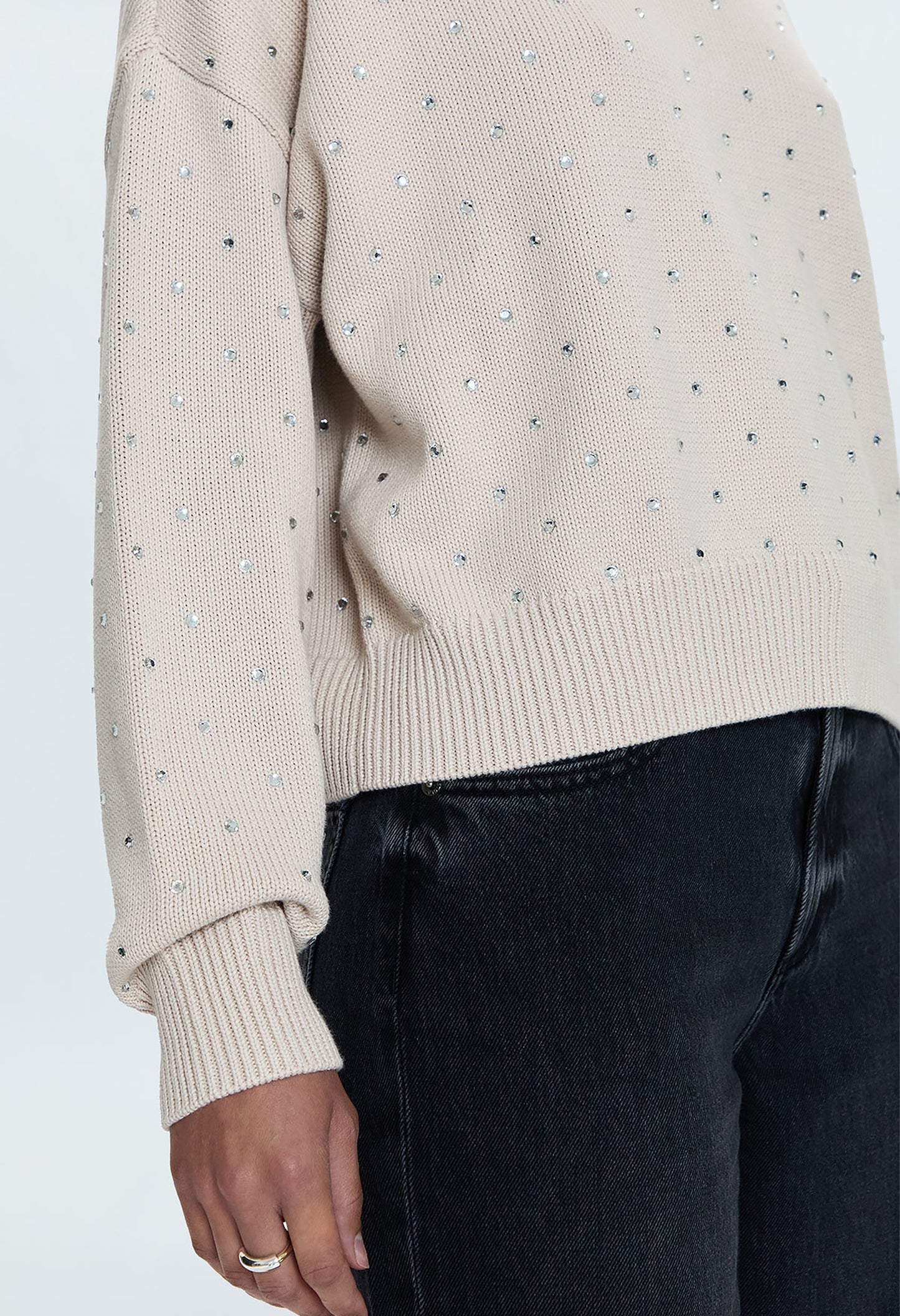 The Steph Crewneck Sweater boasts a scooped crew neckline with exaggerated ribbing, creating a relaxed and effortless silhouette. The versatile Crystal Mink colour is elevated with delicate micro crystal embellishments, perfect for a statement look this season.
