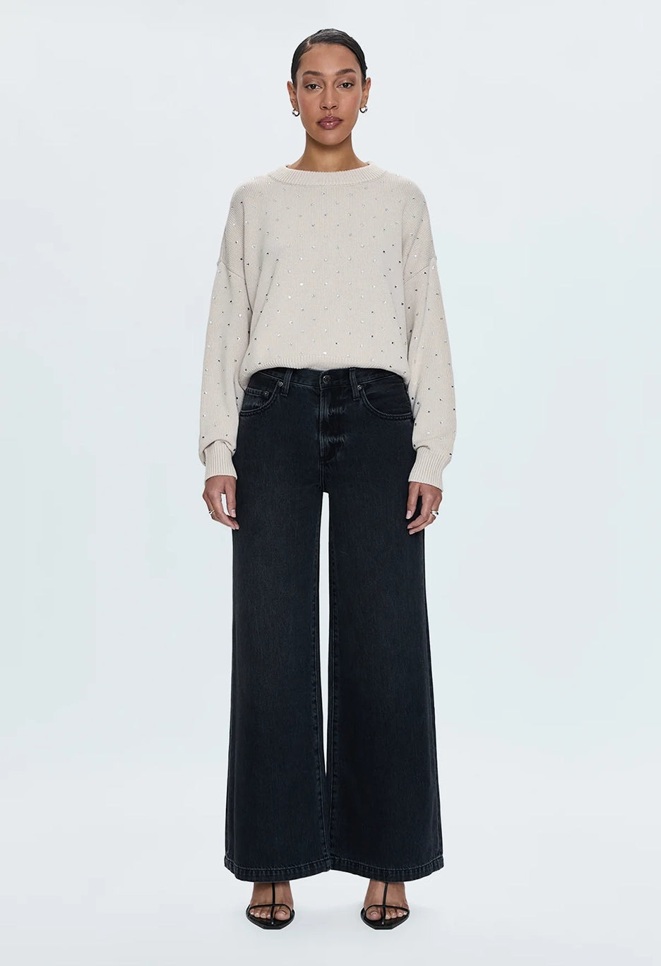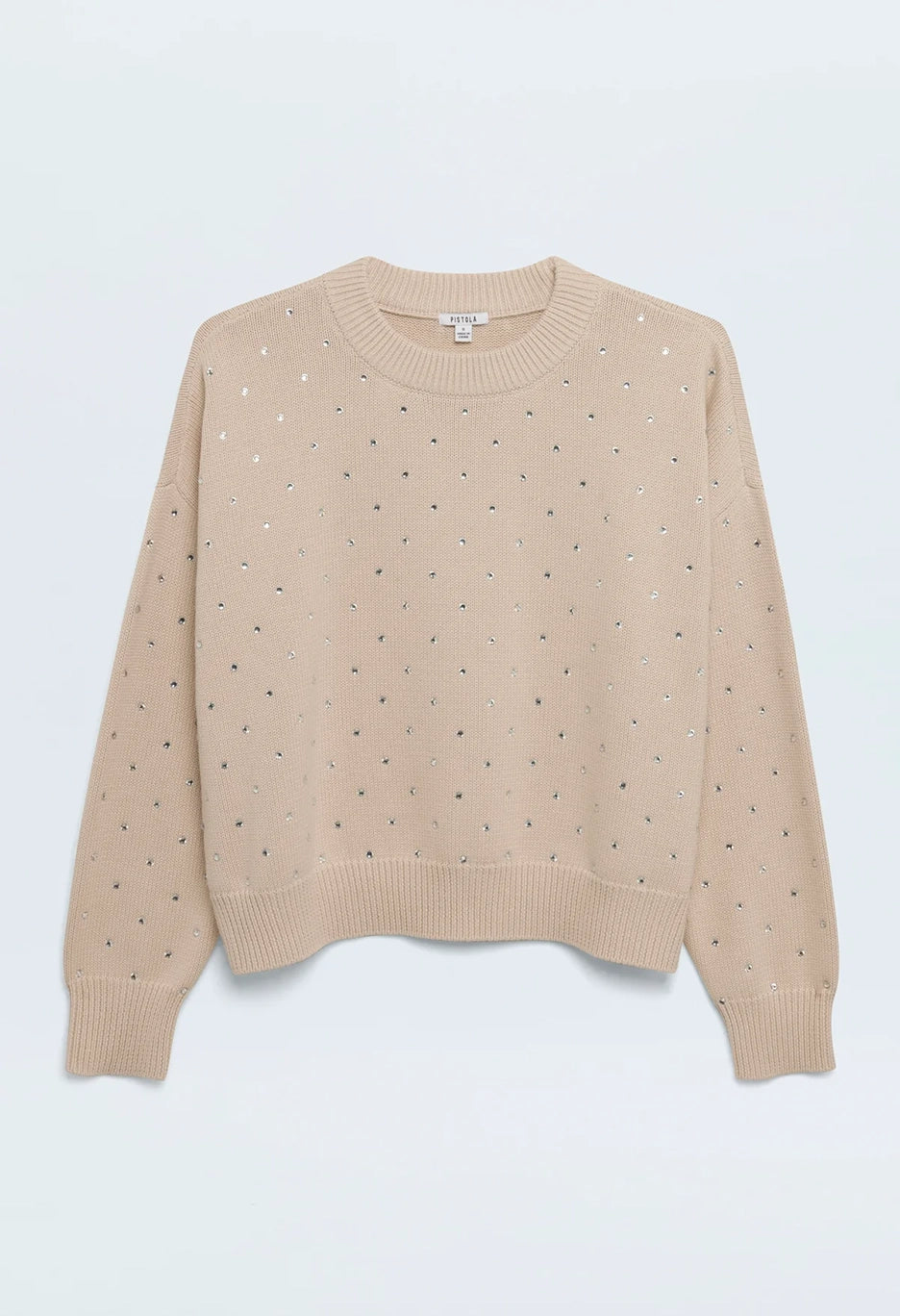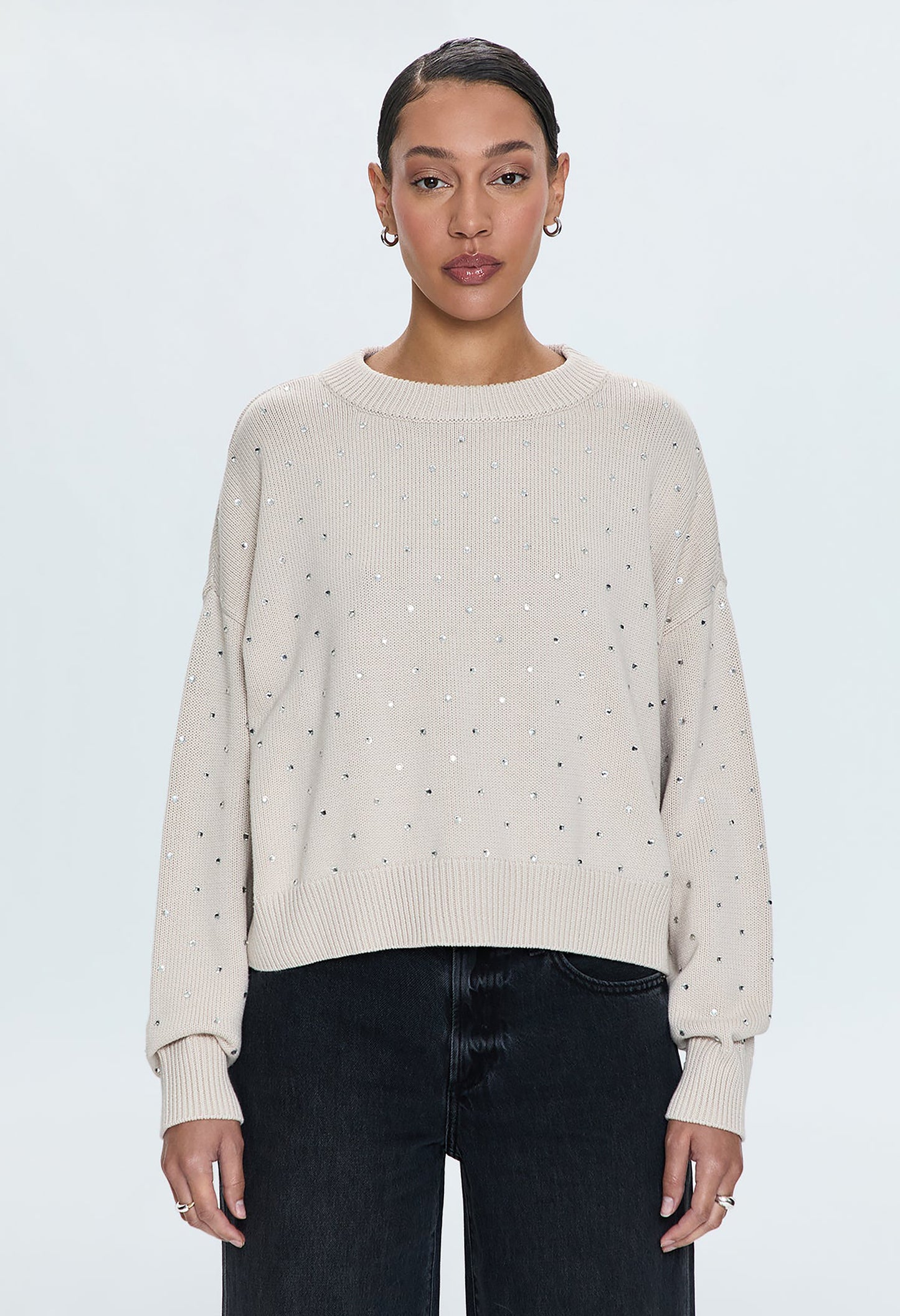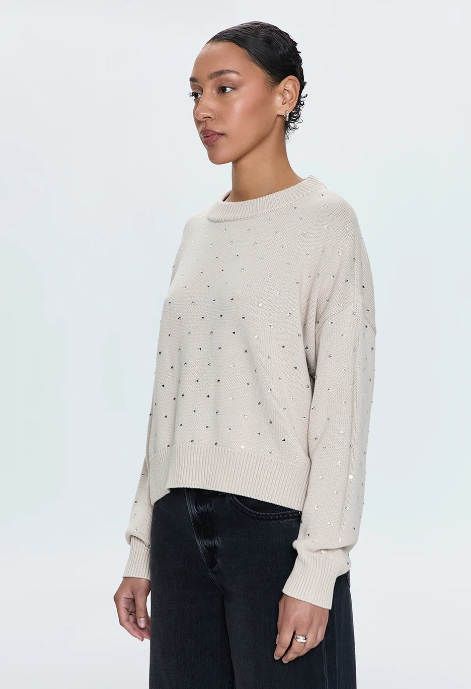 The Steph Crewneck Sweater boasts a scooped crew neckline with exaggerated ribbing, creating a relaxed and effortless silhouette. The versatile Crystal Mink colour is elevated with delicate micro crystal embellishments, perfect for a statement look this season.