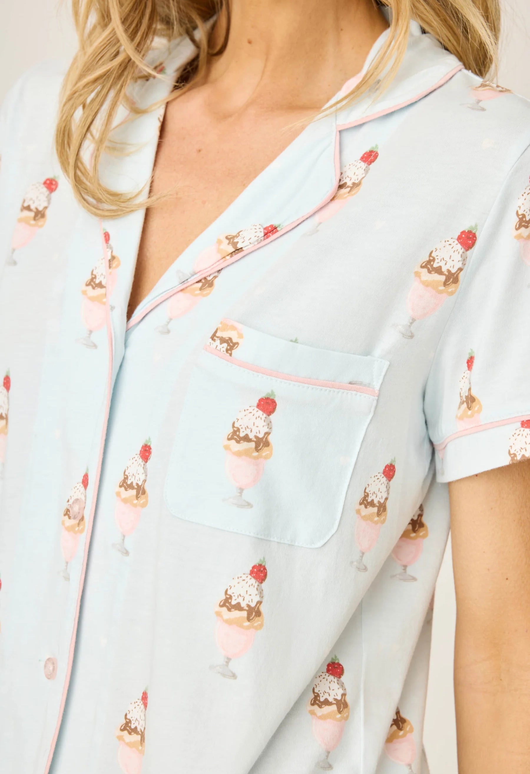 Transform your relaxation time into a delightful experience with this adorable light blue ice cream pajama set. The set includes a short-sleeve top featuring a playful ice cream graphic, tie-waist shorts with a delicate pink trim, and a matching headband for added fun. Made from a soft cotton-rayon blend, it's perfect for lazy mornings and dreamy afternoon naps. This style is proudly made in a Women Empowered Factory (51% owned, controlled, or managed by women).