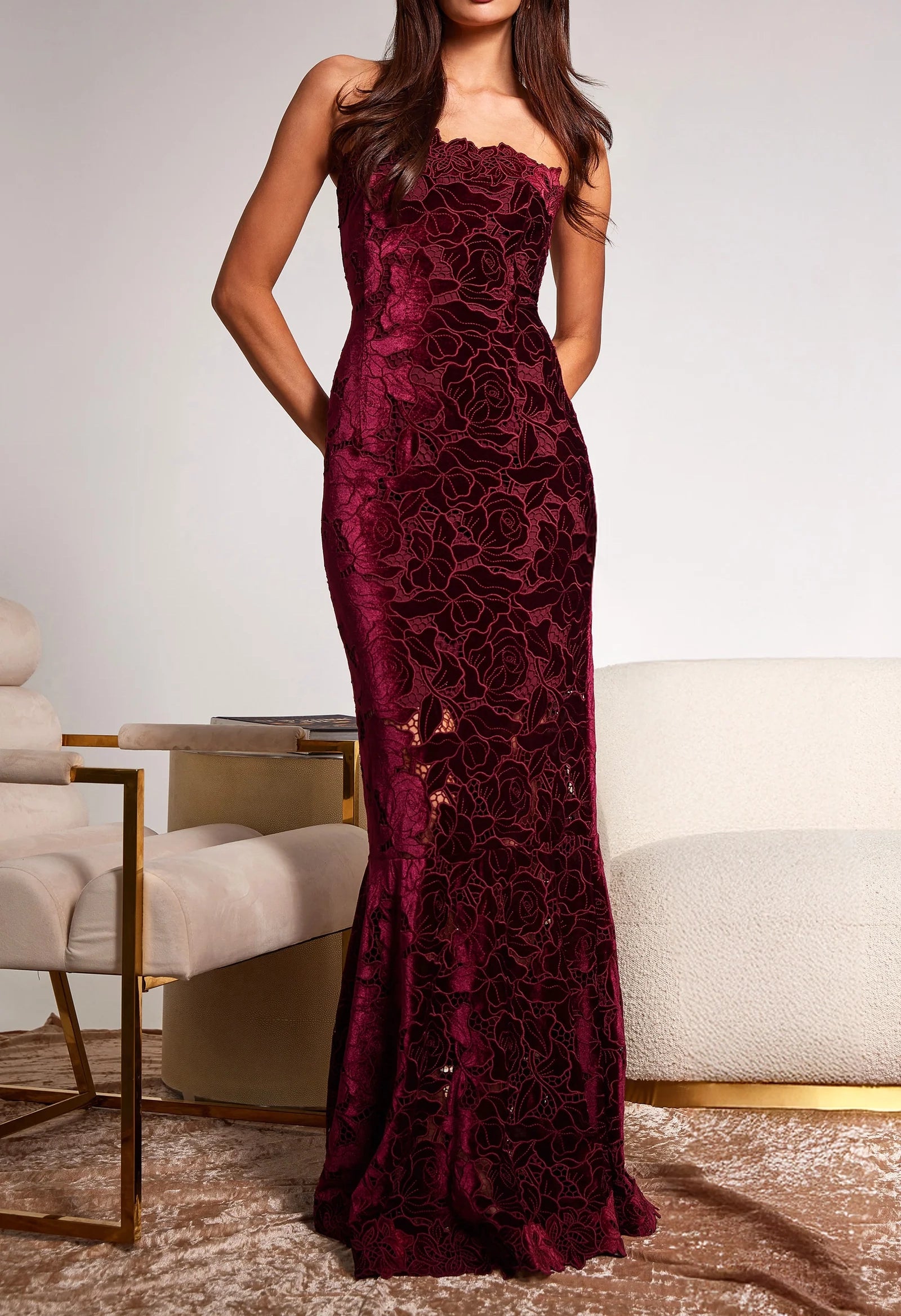 Elevate your evening wardrobe with the Tamara Velvet Lace Dress, a stunning strapless gown that commands attention. Luxurious crimson velvet forms the foundation, beautifully enhanced by delicate lace detailing across the bodice and skirt. The fitted silhouette gracefully transitions into a flowing hem, creating an elegant line that moves with you. The sumptuous fabric's lustrous finish ensures you'll shimmer throughout your special occasion. Ideal for formal events, celebrations, and memorable nights out, this dress embodies refined elegance and timeless style.