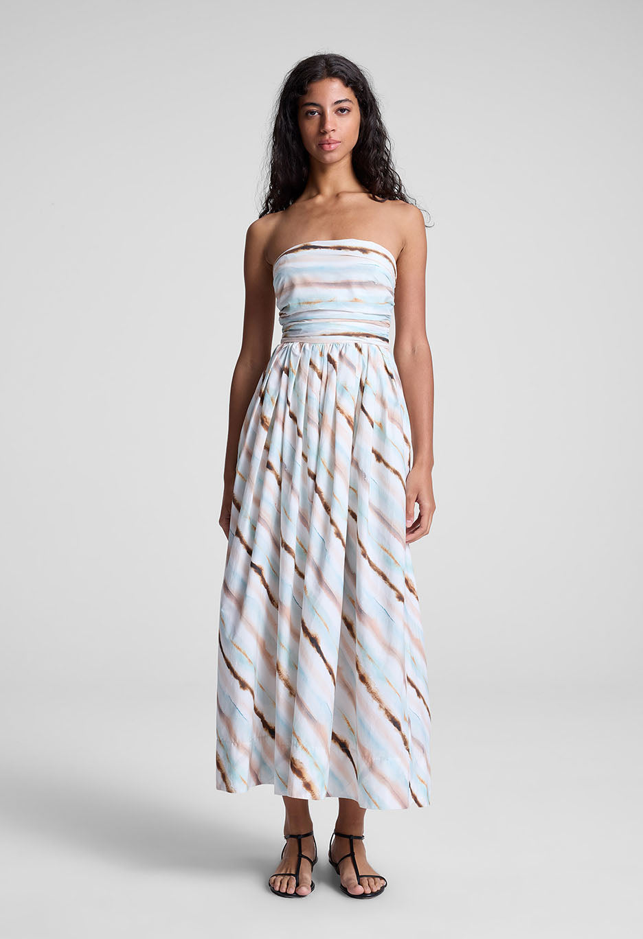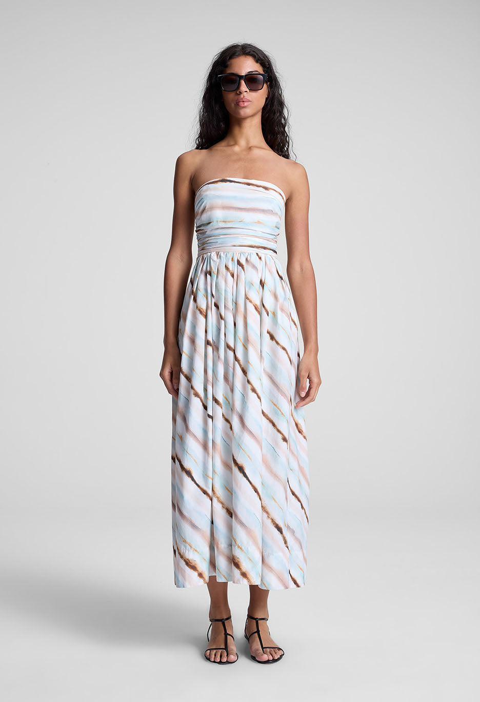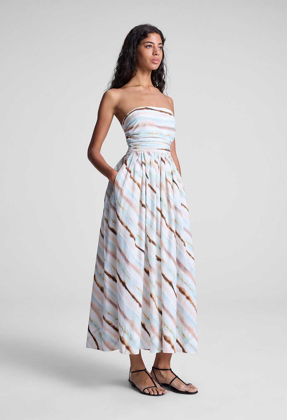 The Tara Dress is a stylish and elegant strapless maxi dress. Its beach tones make it perfect for any vacation or summer event. Look effortlessly chic and feel comfortable in this dress.