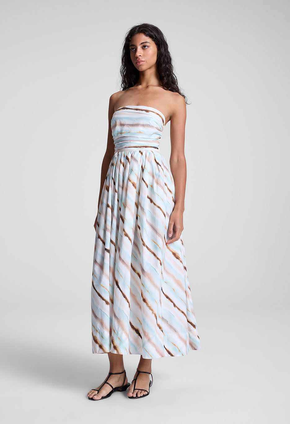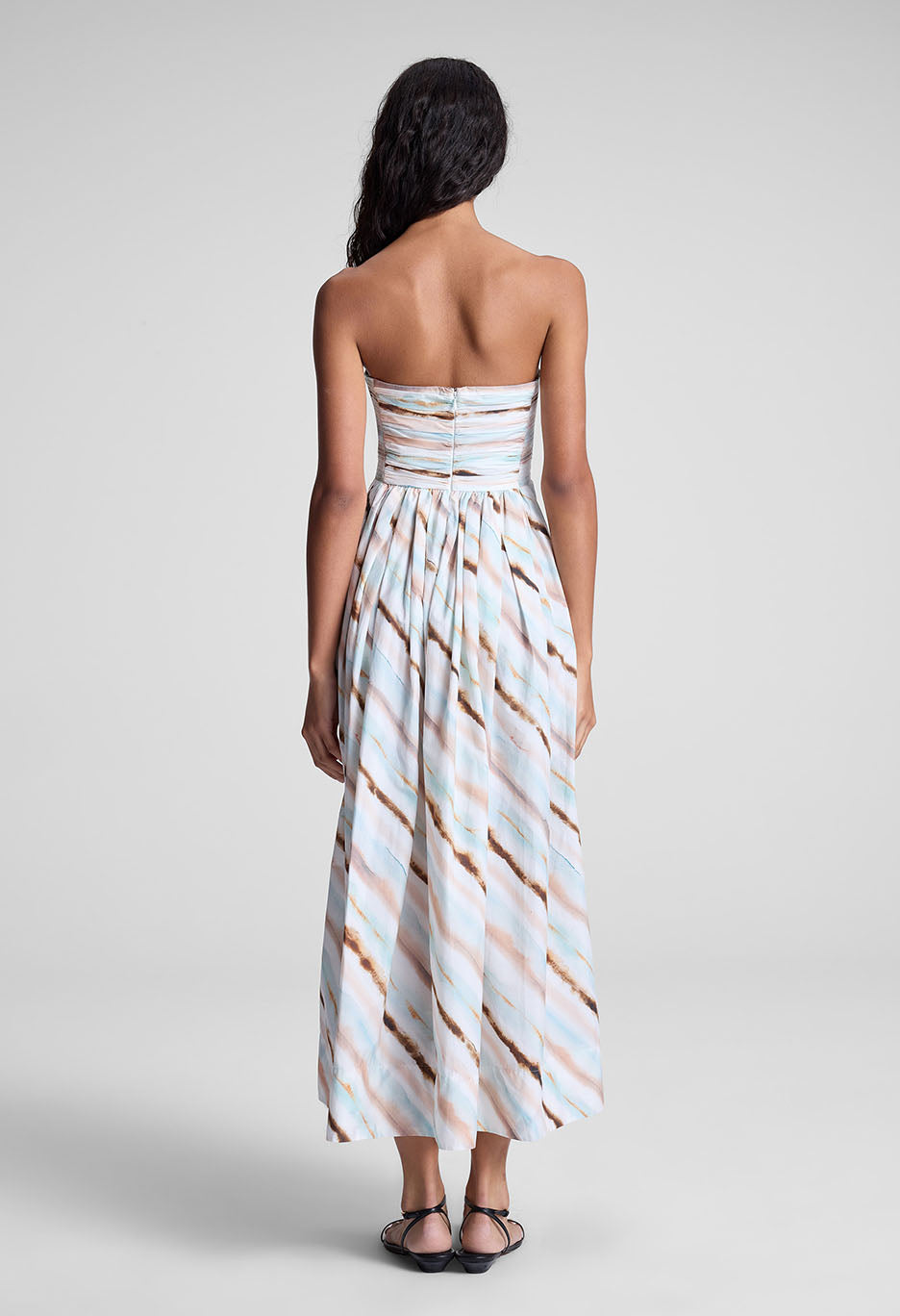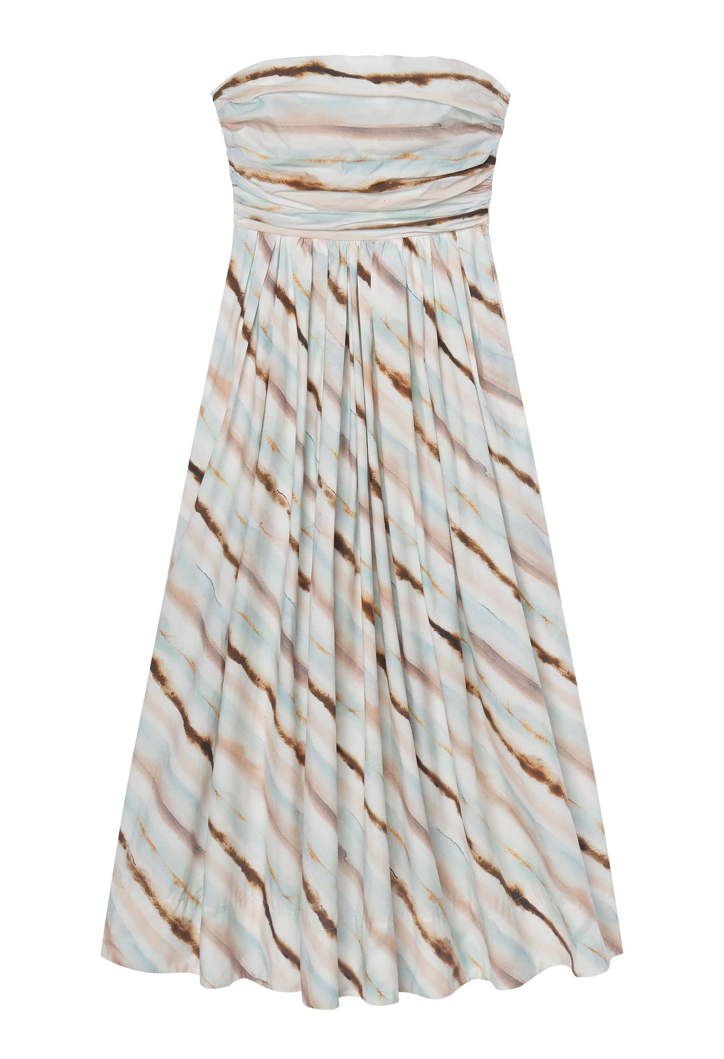 The Tara Dress is a stylish and elegant strapless maxi dress. Its beach tones make it perfect for any vacation or summer event. Look effortlessly chic and feel comfortable in this dress.