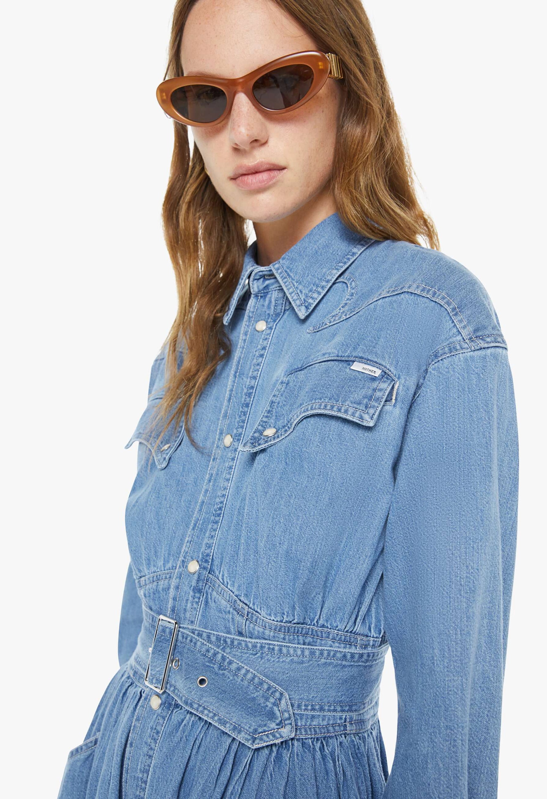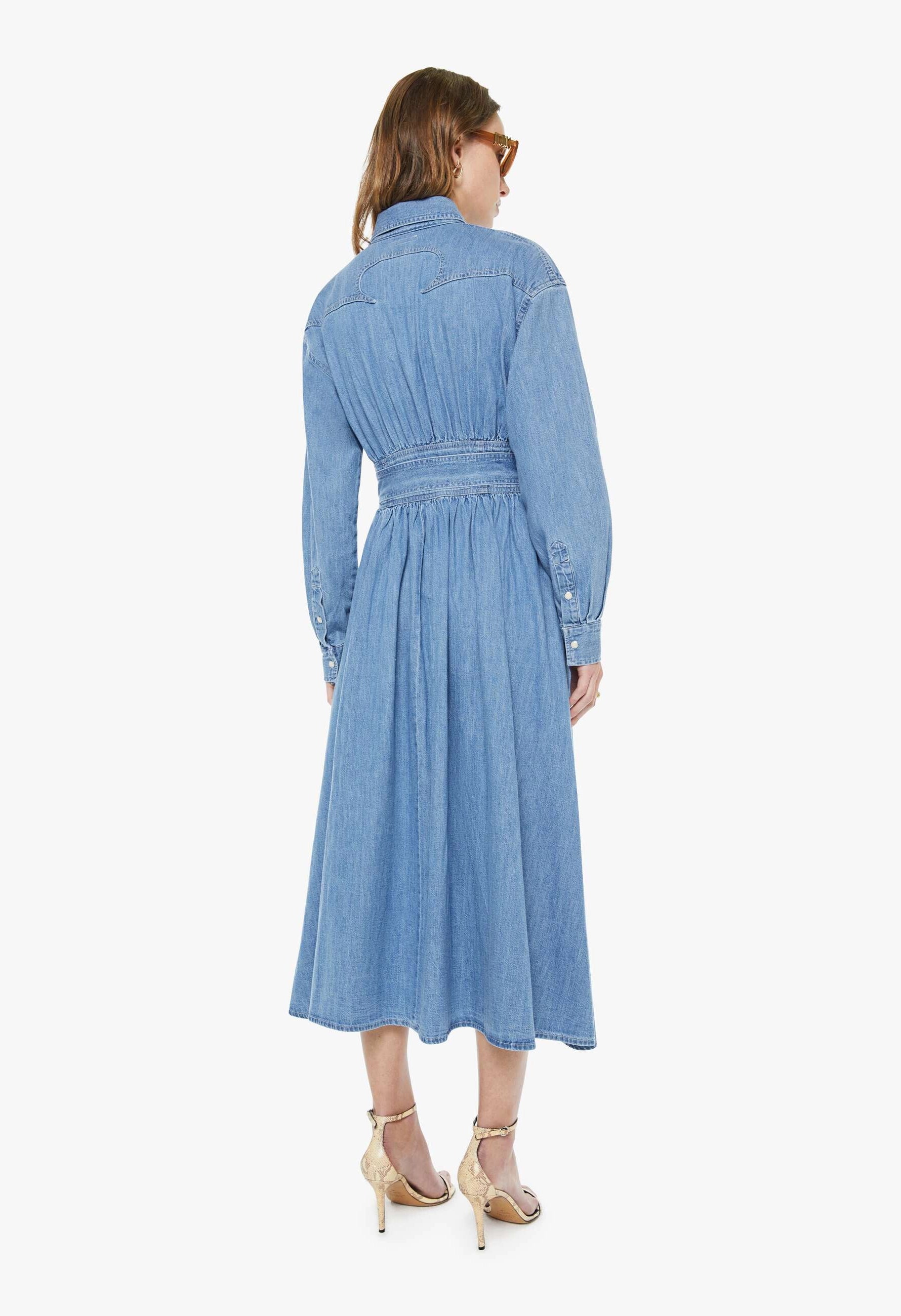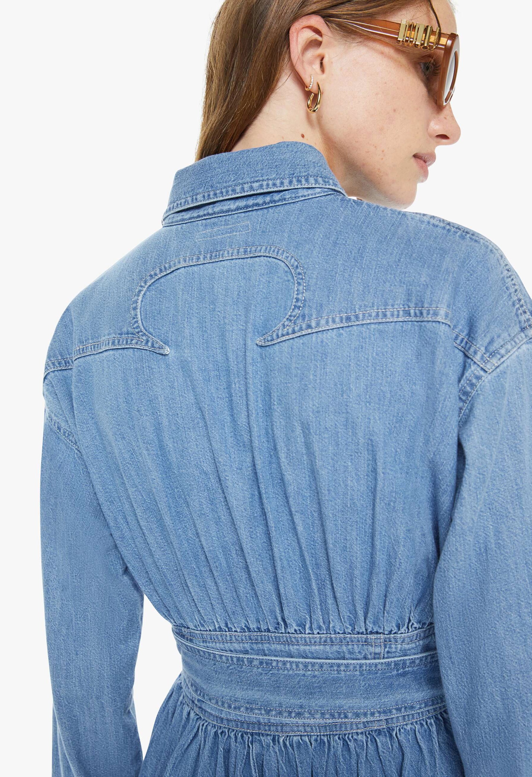 A vintage-inspired denim maxi dress in soft faded blue. Features a collared neckline, puffed sleeves, fitted waist with detachable belt, patch pockets, and faux-pearl snaps. Made from 100% cotton for comfort and durability. Perfect for any occasion.