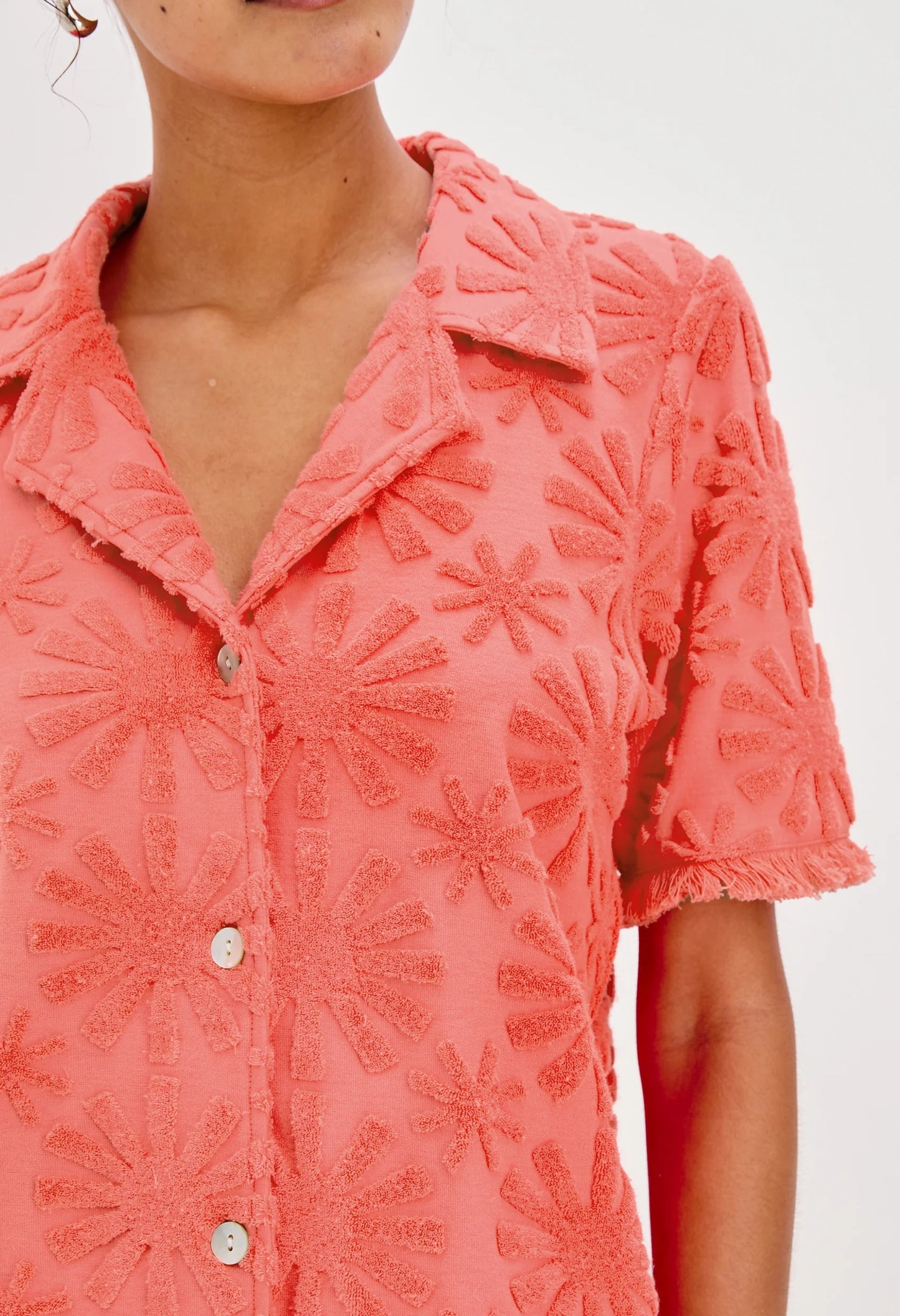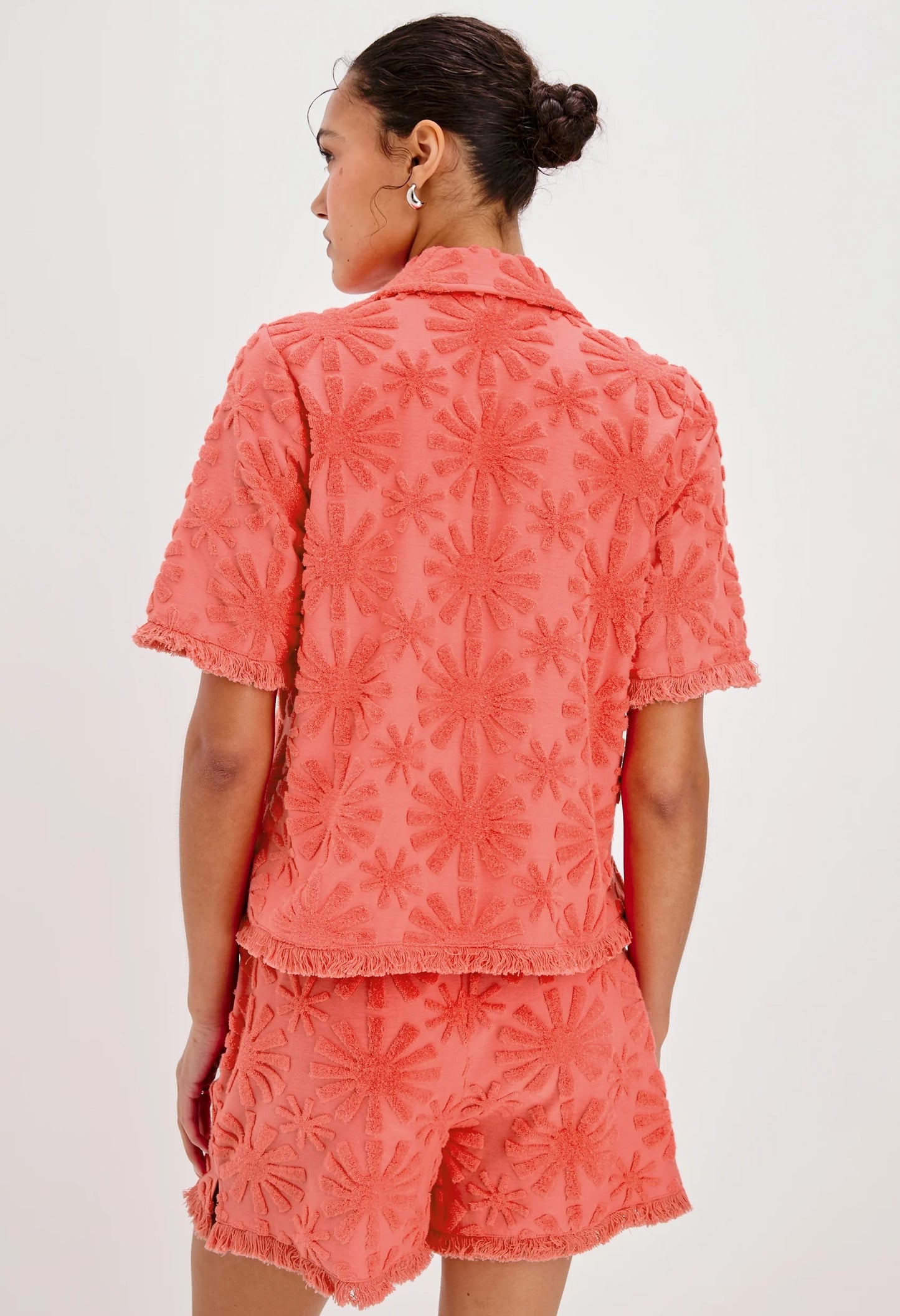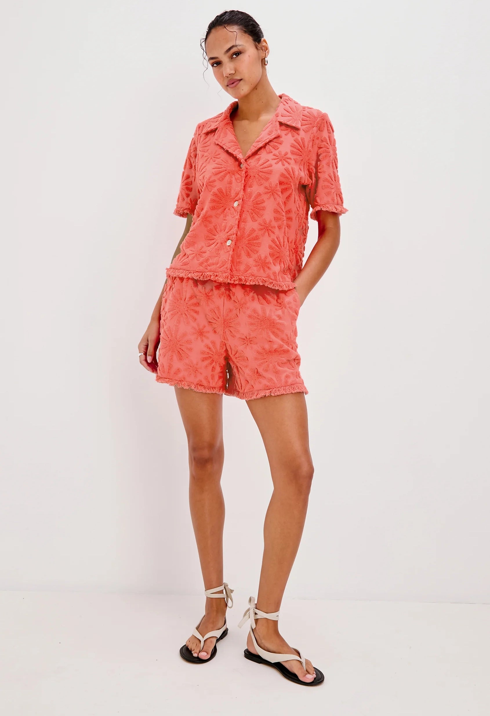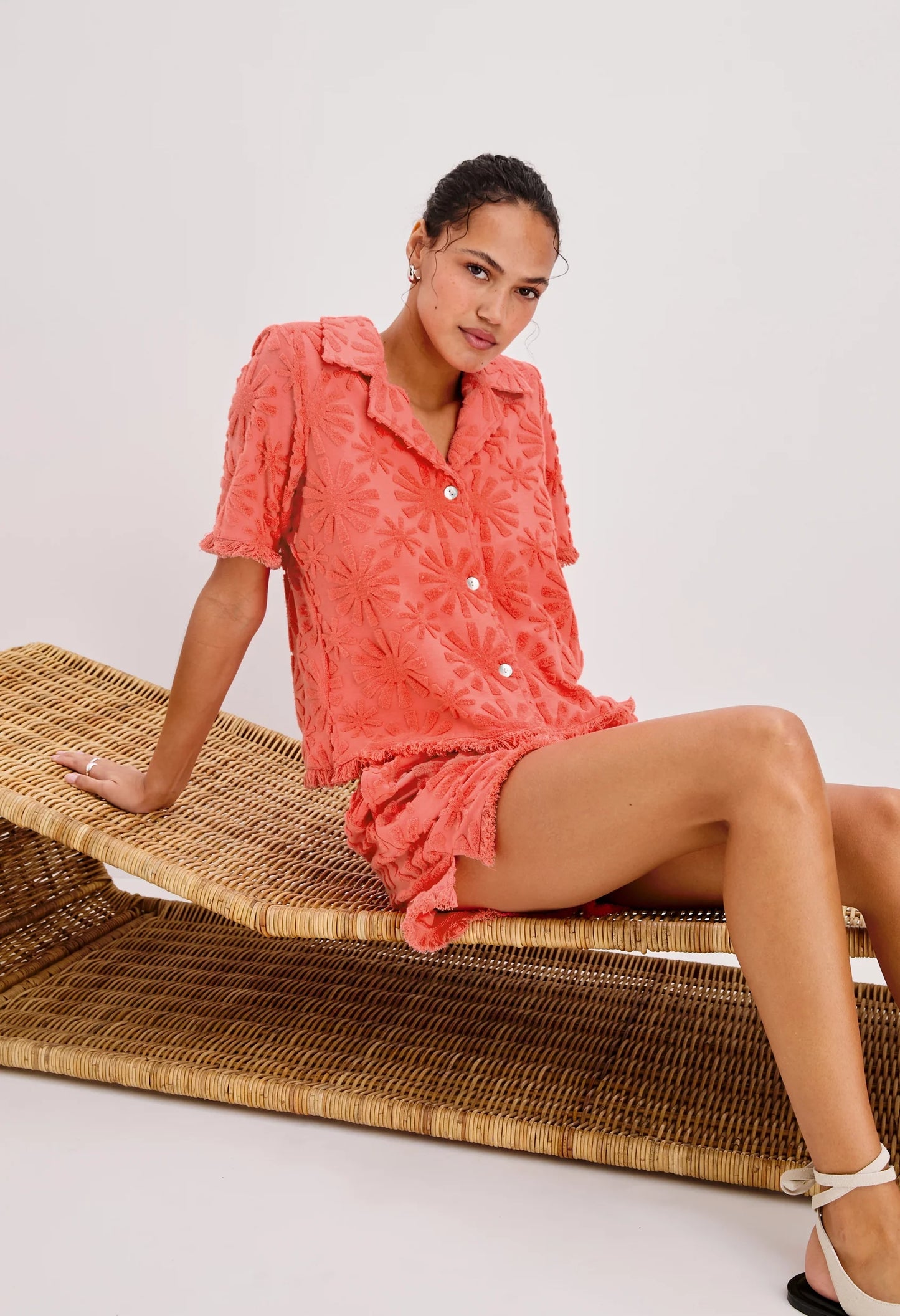 The Tiff shirt features a boxy silhouette with button-up styling, crafted from soft terry fabric and accented with fringe along the sleeves and hem. It can be worn open or closed and pairs perfectly with the River Shorts for a coordinated look.