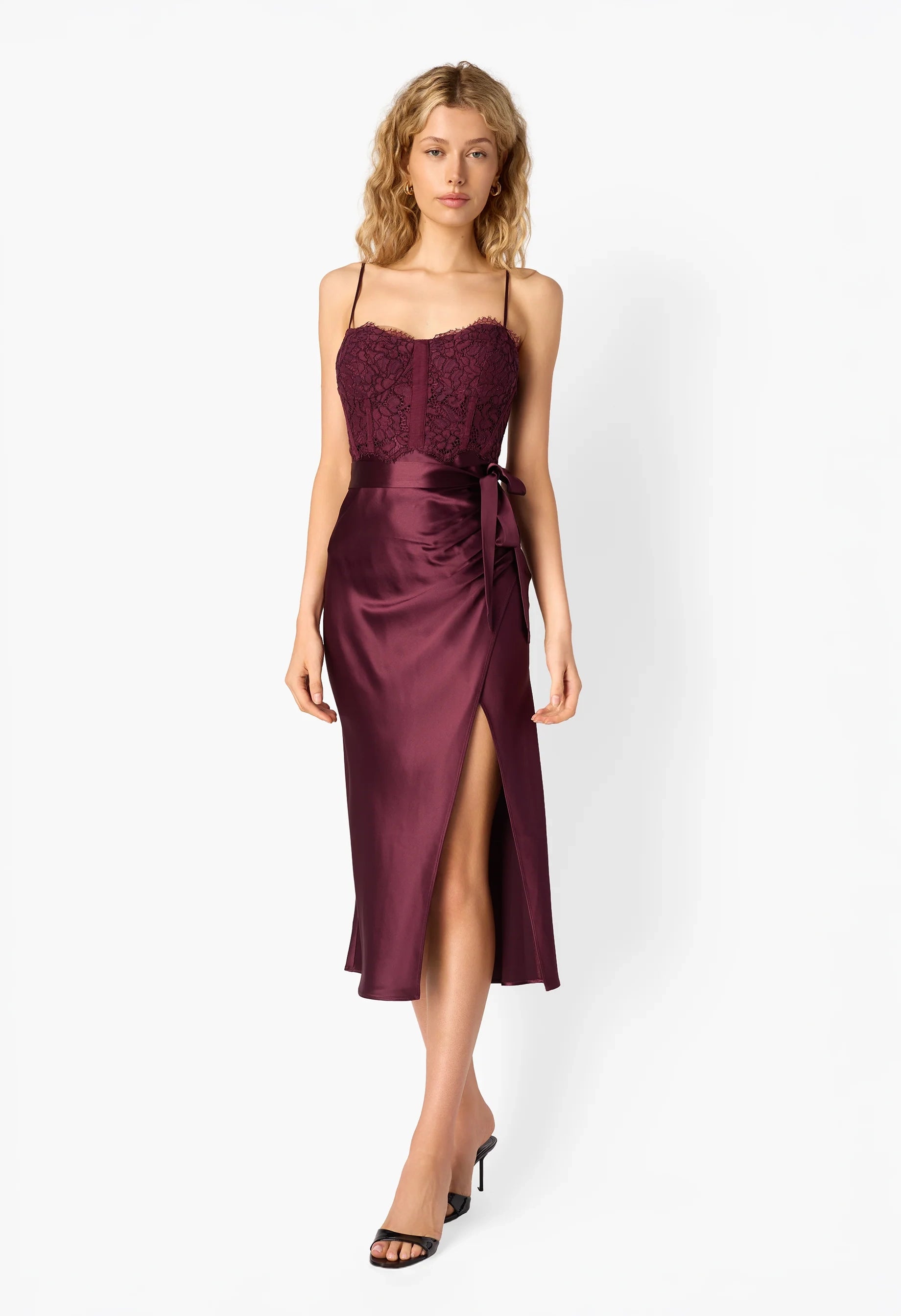 The Tricia Corset Dress is a midi-length slip dress featuring a lace corset bodice with underwire and boning for a structured, flattering fit. It showcases a sheer lace scalloped edge at the top and adjustable straps for personalized comfort. An invisible side seam zipper with hook and eye closure provides a clean silhouette. The corset is fully lined, while the skirt remains unlined for a light, airy feel—perfect for refined and elegant occasions.