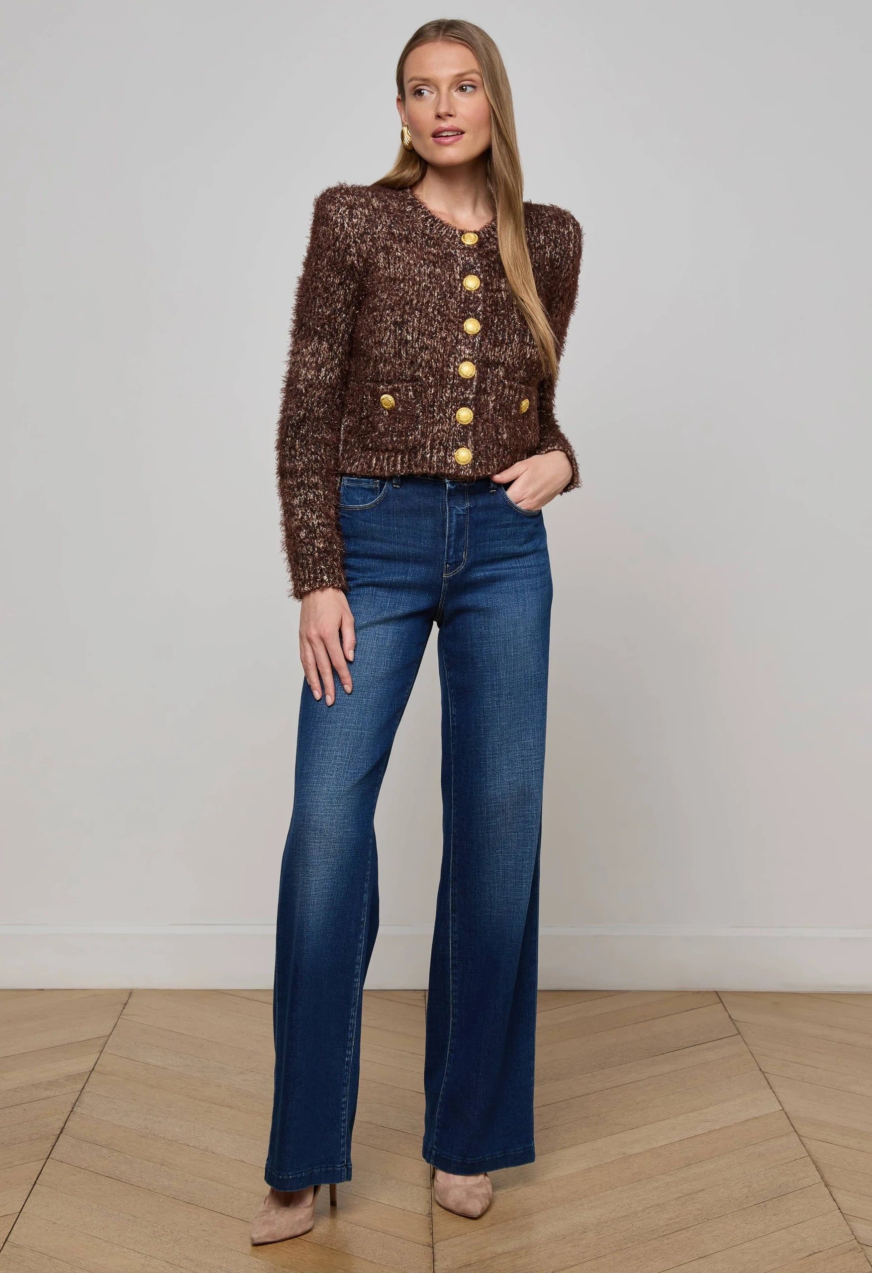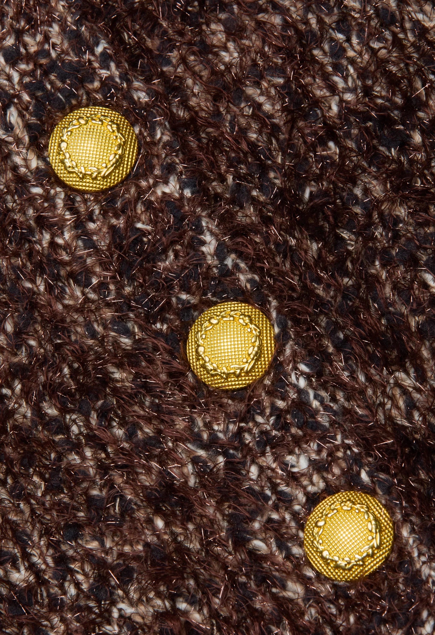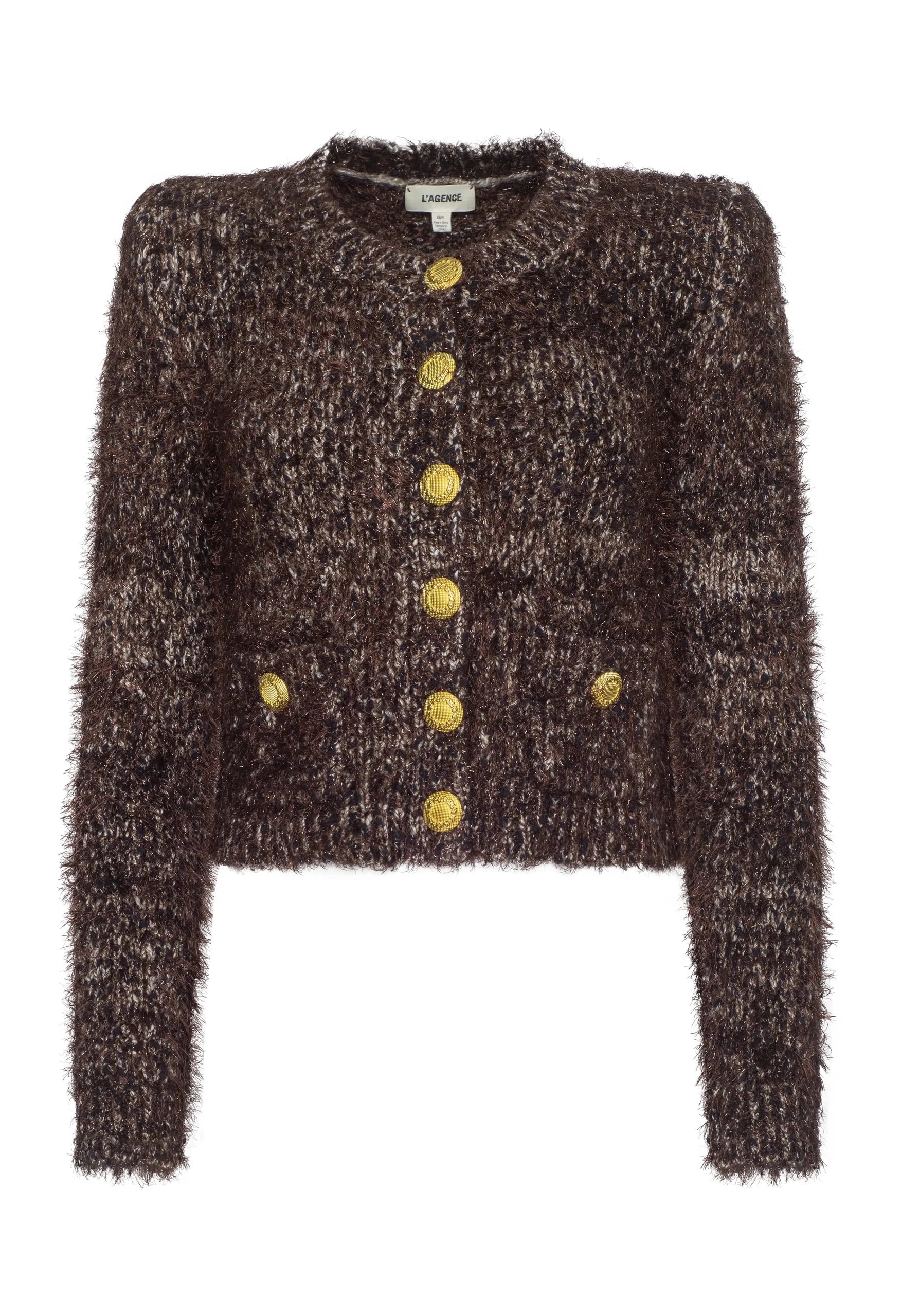 The Una Knit Cardigan features a textured knit design with a touch of lurex for a delicate shimmer within a timeless shape. Oversized buttons enhance its sophisticated appeal, complemented by a boxy, cropped cut that offers a sleek, tailored appearance. Combining comfort with refinement, this adaptable piece adds both structure and subtle shine to your outfit, suitable for wearing as either a top or a layering piece.