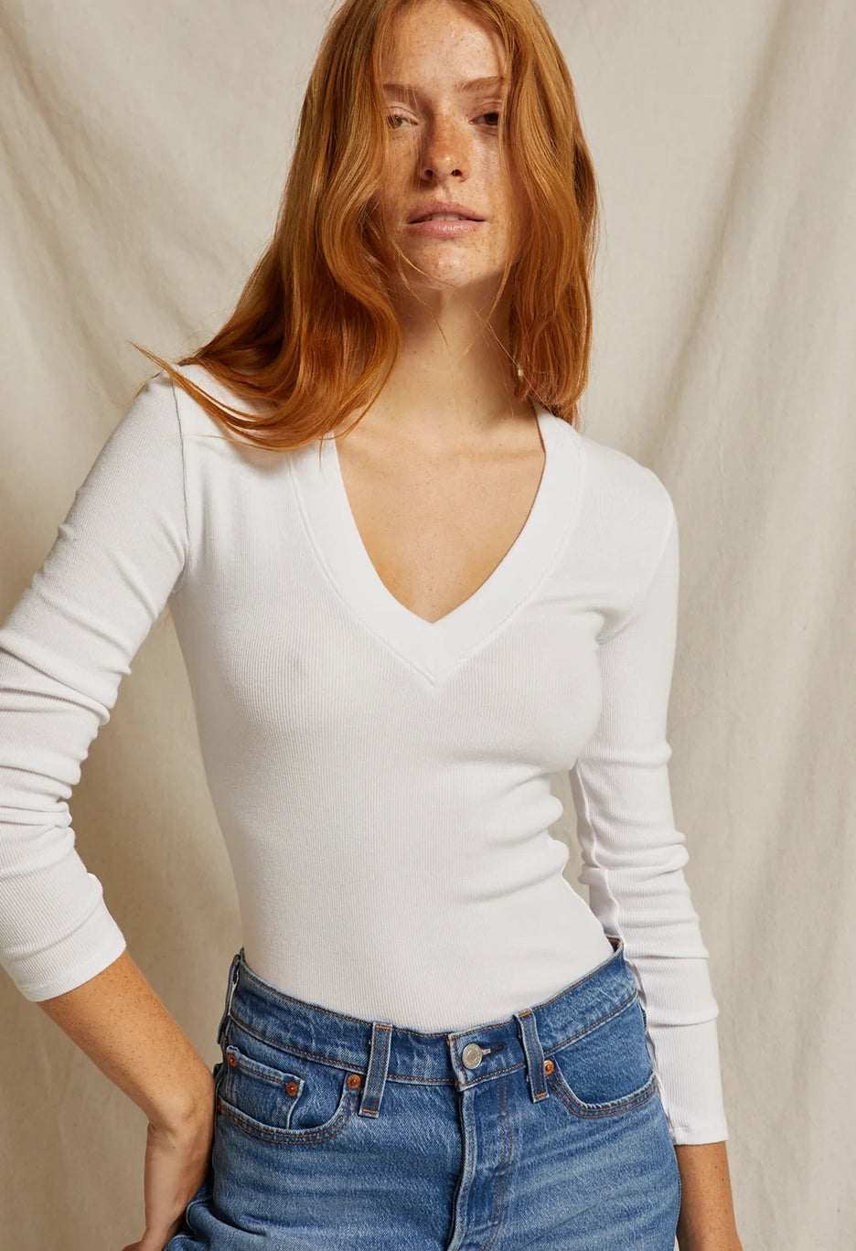 For a flawless, tailored fit, this Viola V-Neck Long Sleeve is designed in a slinky cotton rib and features a wide v neck. Its versatility makes it a perfect pairing with denim, adding an elevated element to any outfit.