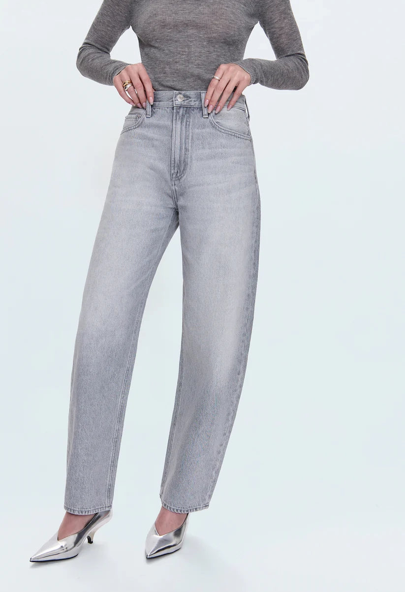 The top-selling Wes jean offers a fresh take on modern denim. Featuring a flattering high-rise fit and a chic barrel leg shape, it boasts a full 30" inseam for a refined, dramatic look. Crisp hem finishes enhance the sleek, contemporary design. Made from our premium rigid, non-stretch denim in the timeless Enigma gray