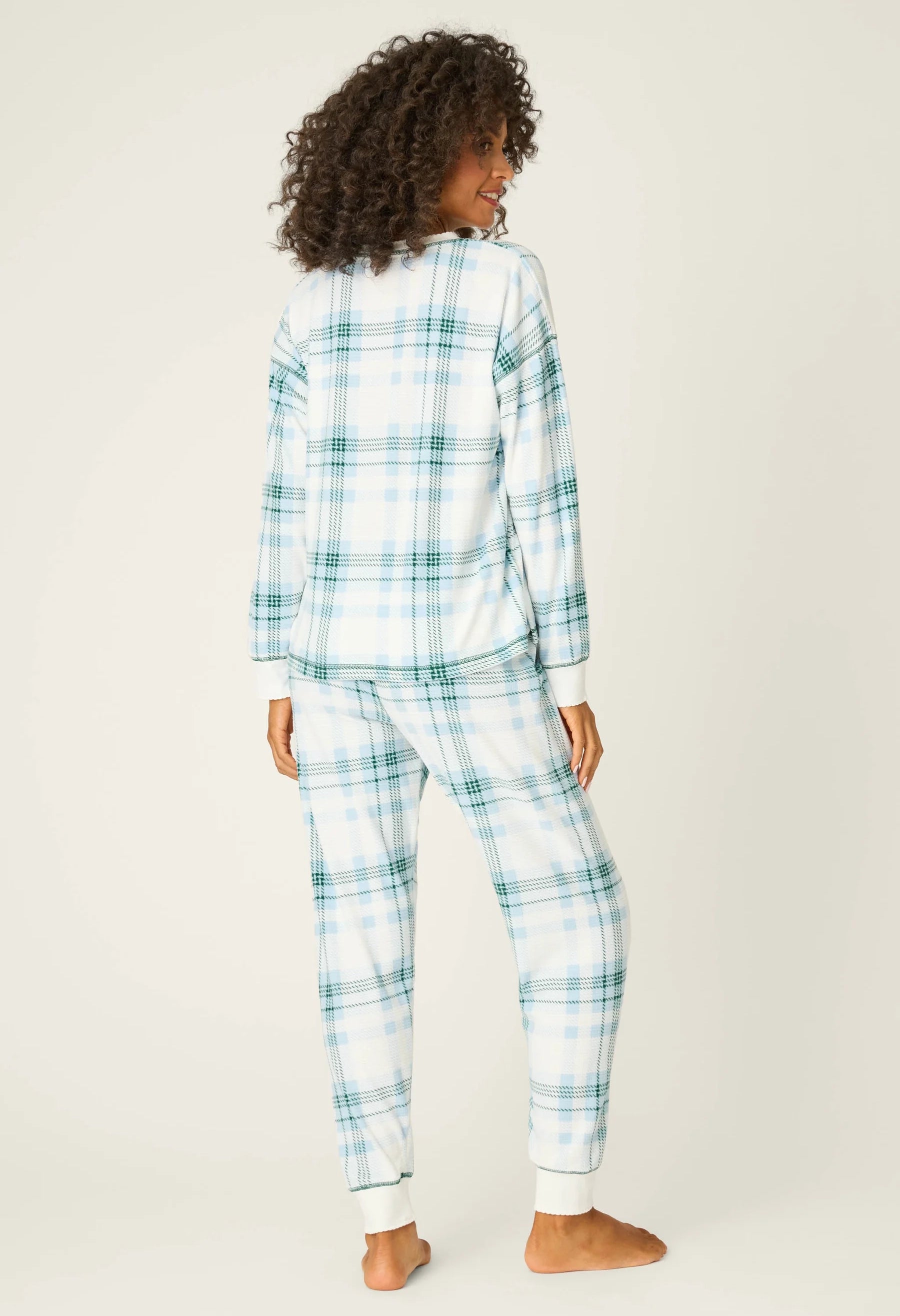 Embrace the season in this thermal velour pajama ensemble, where festive plaid detailing meets everyday comfort. The set includes a long-sleeve crew neckline top paired with drawstring pants, accented with decorative green buttons and a faux fly detail. Perfect for creating those cherished winter moments, whether you're enjoying holiday gatherings or settling in for peaceful evenings by the fire.